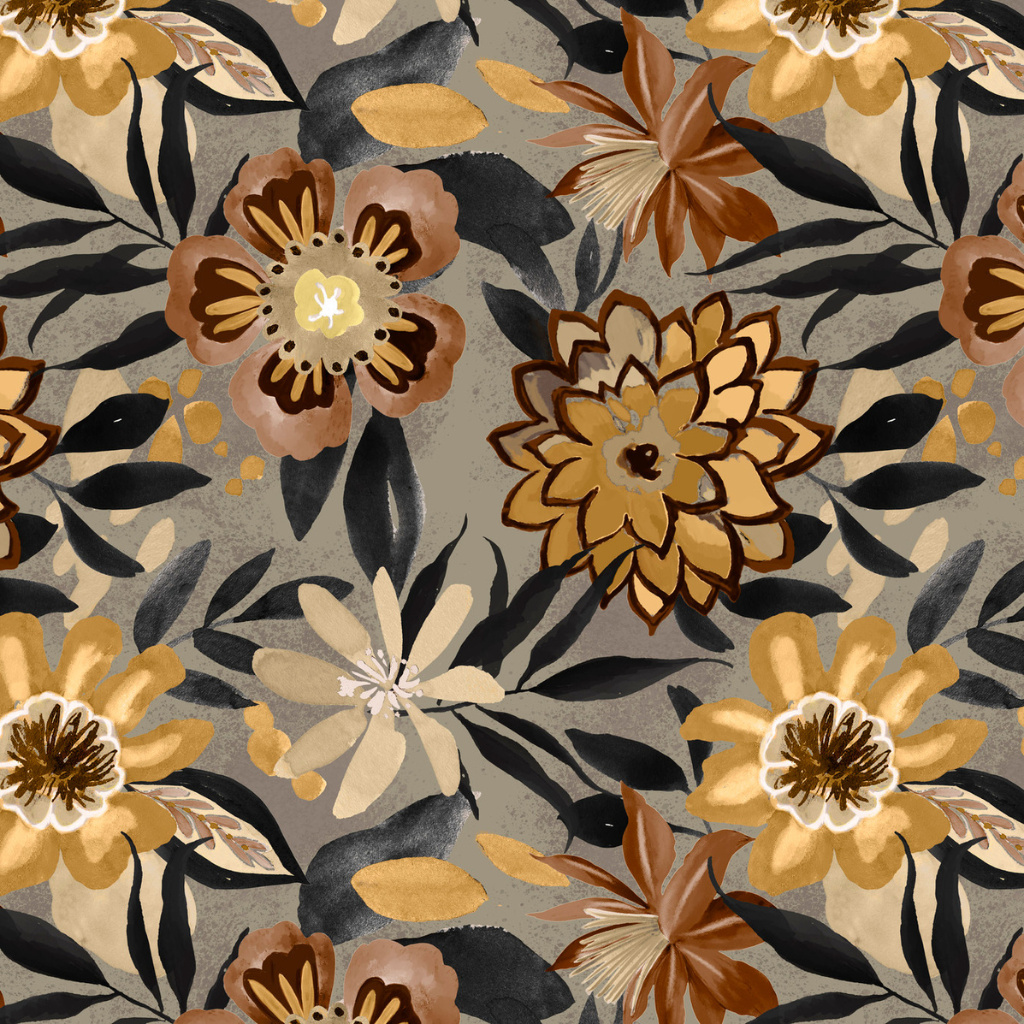 A warm black and golden floral that whispers charm, grace, and a vintage feel.
