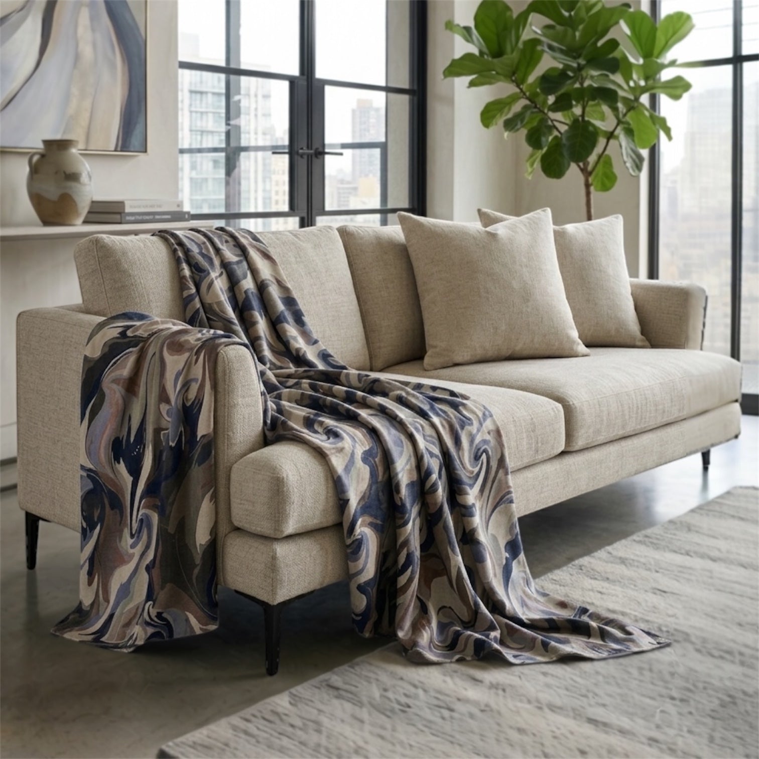 Brushstrokes Blue is available as fabric by the metre, cushion covers, and decorative throws, and is suitable for curtains, and upholstery.