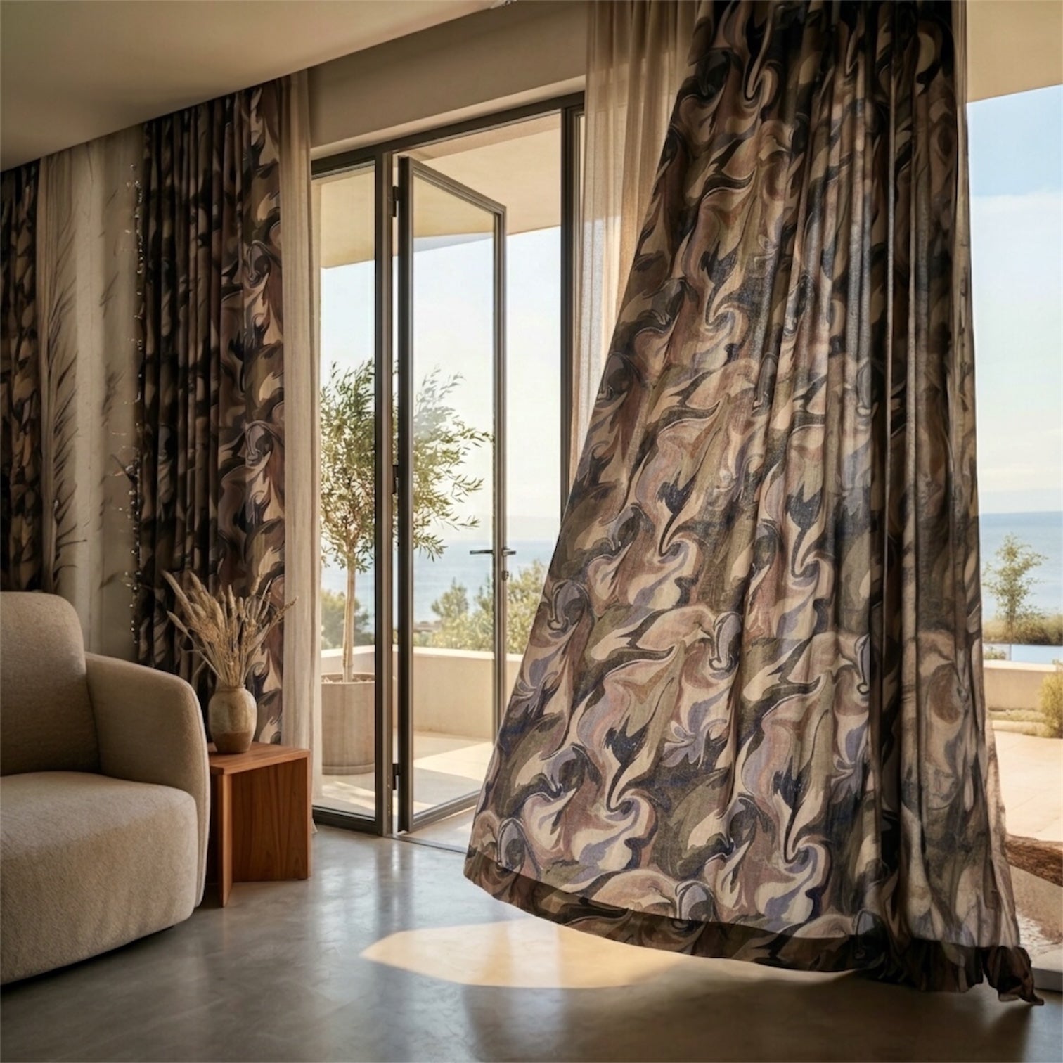 Inspired by fine art and painterly movement, Brushstrokes Blue transforms fabric into a statement of texture, warmth, and quiet sophistication. Flowing abstract forms and layered cool tonal layers create calm, painterly movement, giving each piece a soft atmospheric hues yet timeless presence.